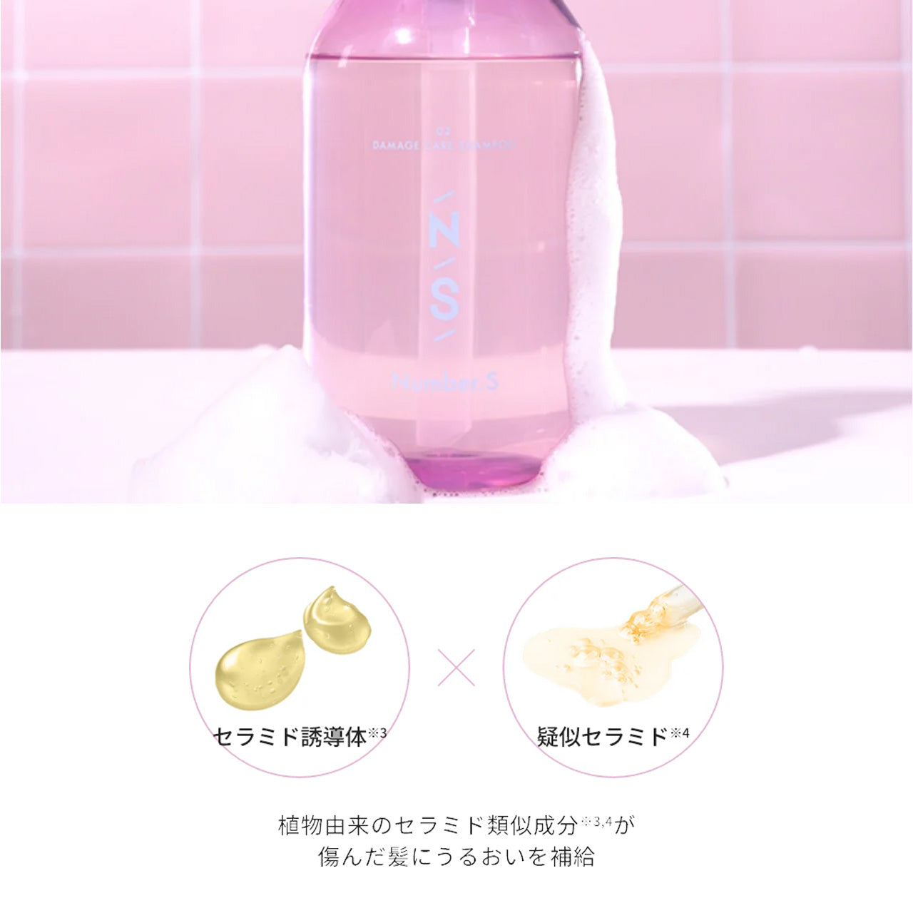 水分や栄養を保持できなくなった髪に、うるおいを運ぶ成分として2種のセラミド類似成分※3,4を補給。水分を抱え込んだ状態で髪の中に浸透するため、髪内部をしっかりとうるおいで満たします。