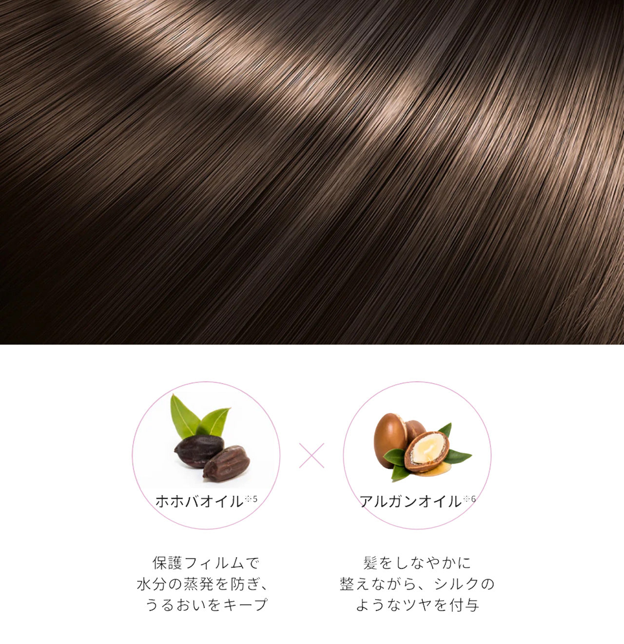 剥がれたキューティクルを補修しながら、植物オイル※5,6で保護フィルムを形成。髪表面を包み込むことで、日々のダメージから髪を守りながらうるおいを与えます。