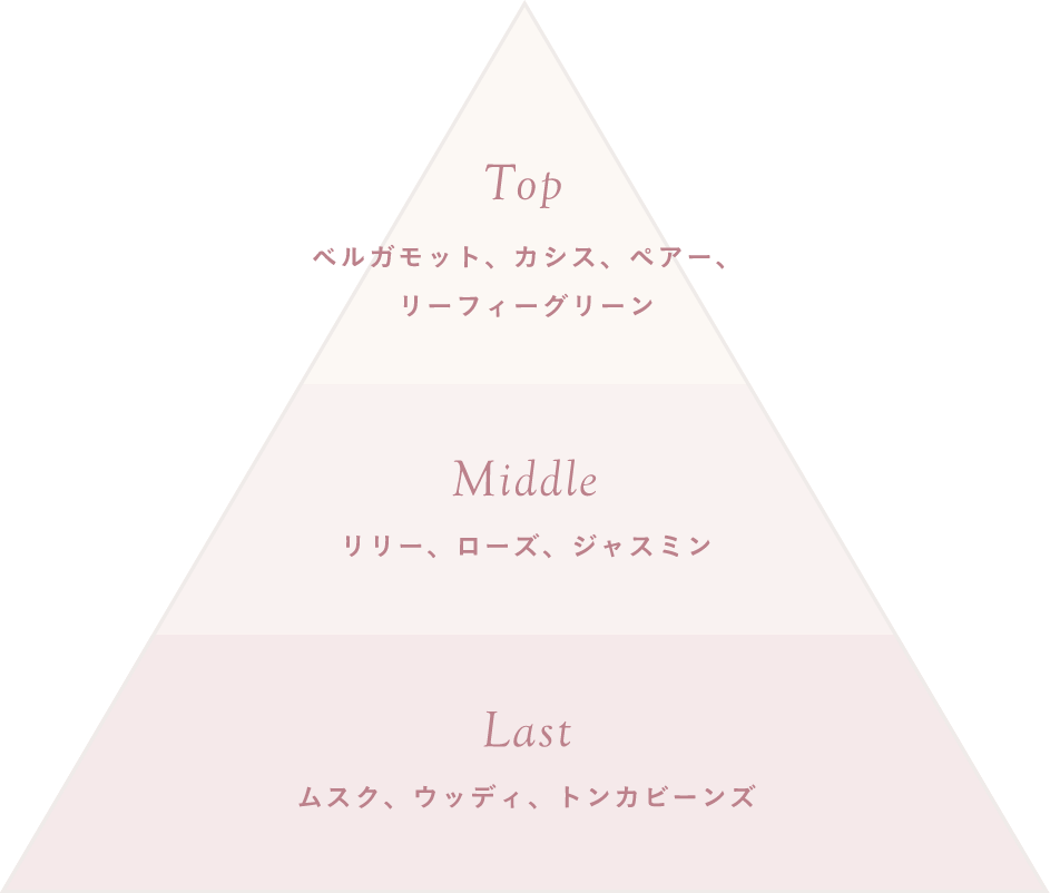 エレガントなリリーとみずみずしいベルガモットが重なり合うフローラル調の香りがやさしく包み込みます。