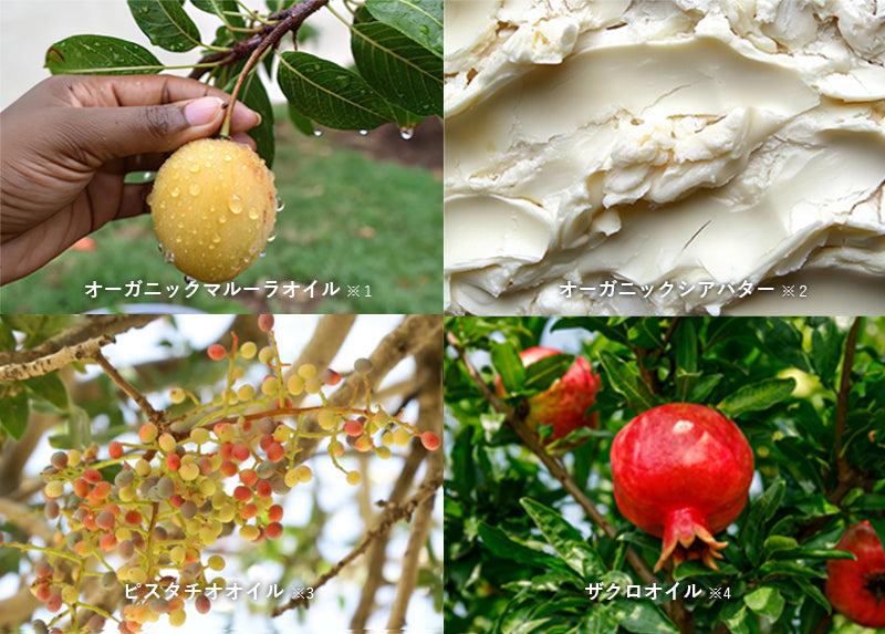 ※1 スクレロカリアビレア種子油 ※2 シア脂 ※3 ザクロ種子油 ※4ピスタシオ種子油(※1~4すべてエモリエント成分)