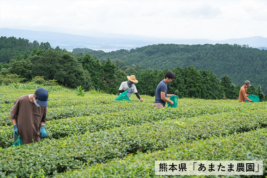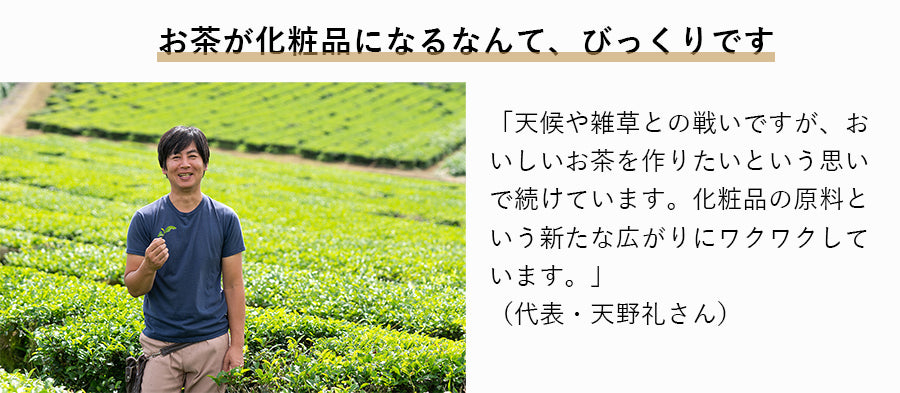DEEPLY EMBRACEシリーズの主成分のひとつである「オーガニック茶葉水」の原料となる茶葉は、有機栽培に信念をもつお茶農家、あまたま農園で生産されています。